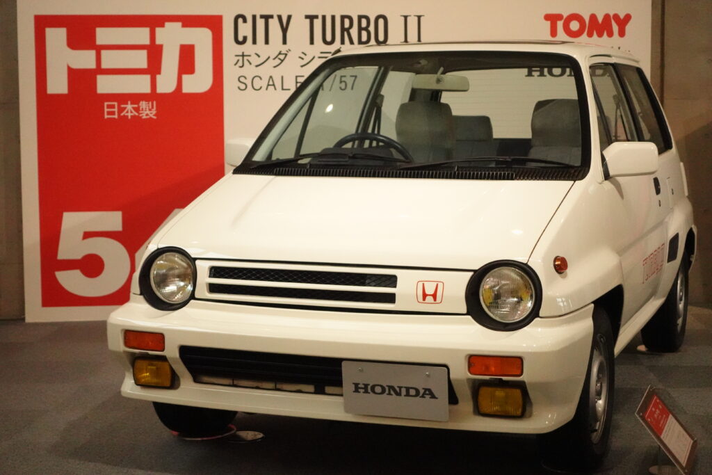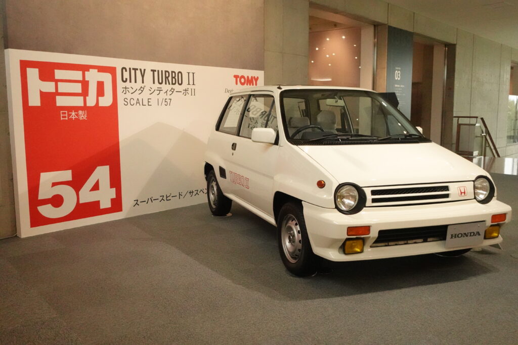 トミカのモデルになったHondaの車両を1/1スケール(実際のクルマの大きさ)の巨大パッケージとともに展示されています。